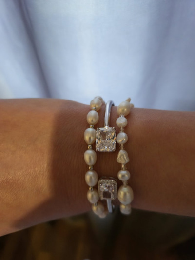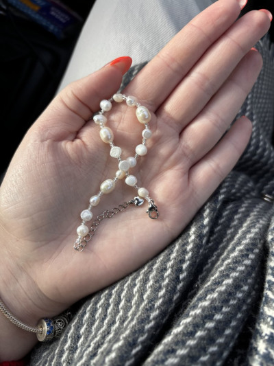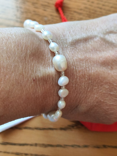 Стальной браслет с жемчугом отлично смотрится на руке!! Размер соответствует, собран на нитку. Жемчуг натуральный.