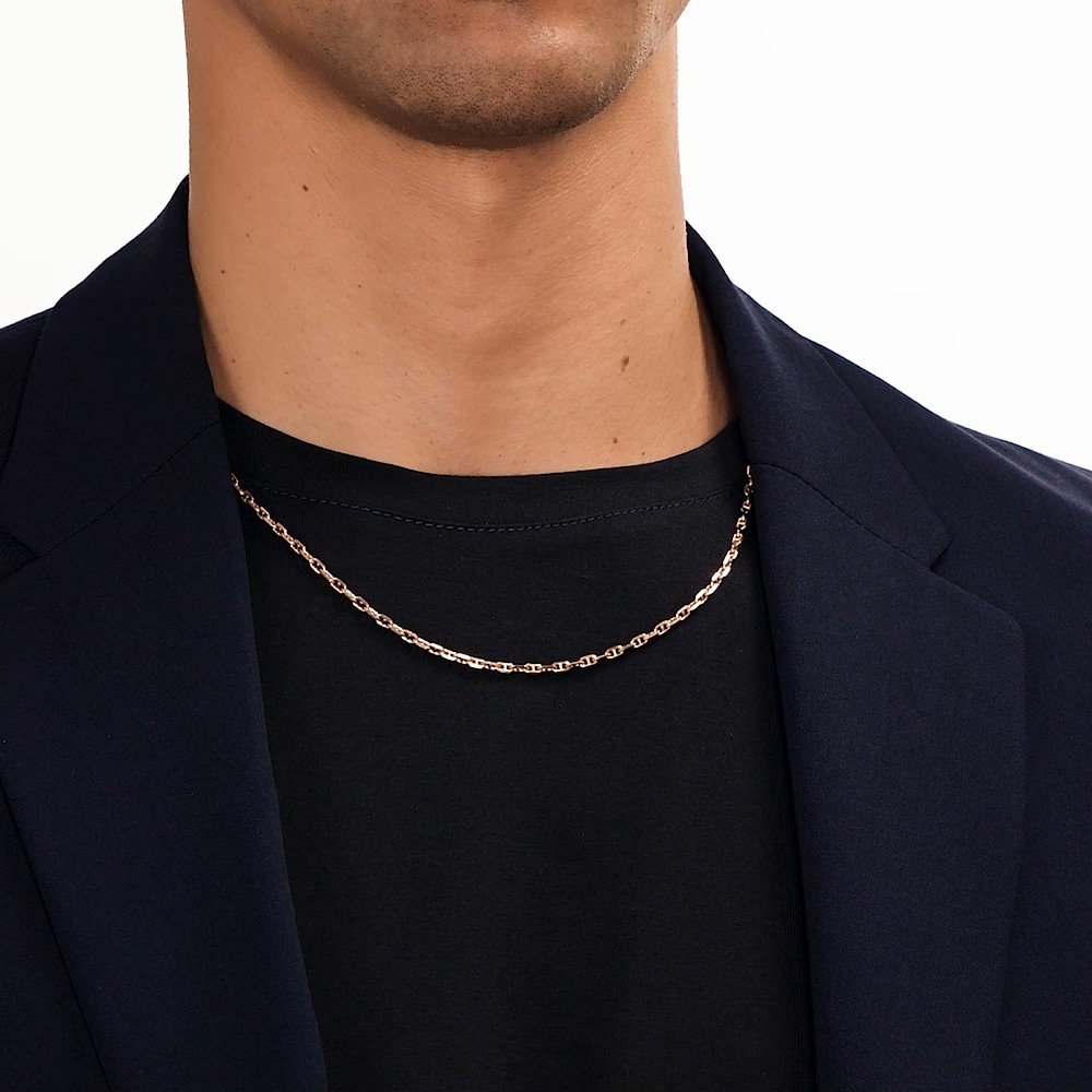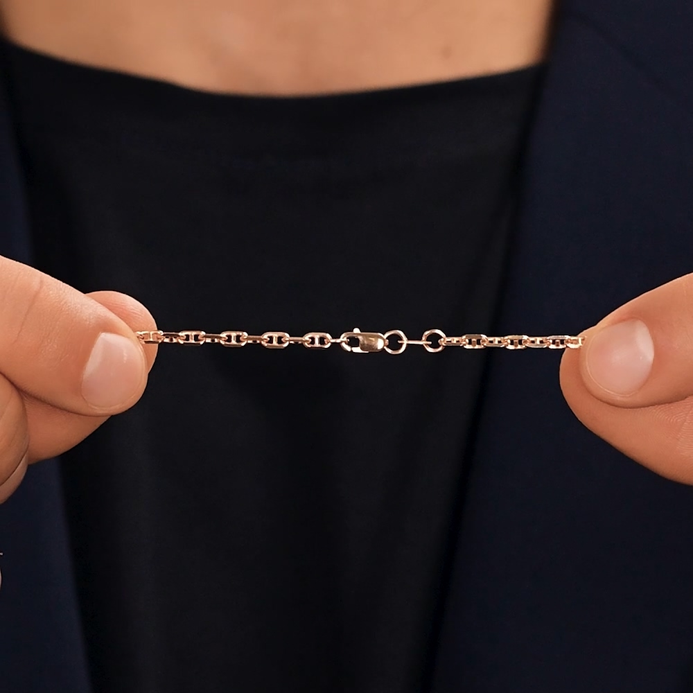 Якорное плетение - настолько надежное, что можно "вешать якорь". Звенья расположены под прямым углом друг к другу, от чего цепь получается объемной и крепкой. Плетение универсально, подходит и женщинам, и мужчинам. Классическая якорная цепь состоит из звеньев продолговатой формы с закругленными концами. Для усиления блеска края обрабатывают алмазной гранью.
