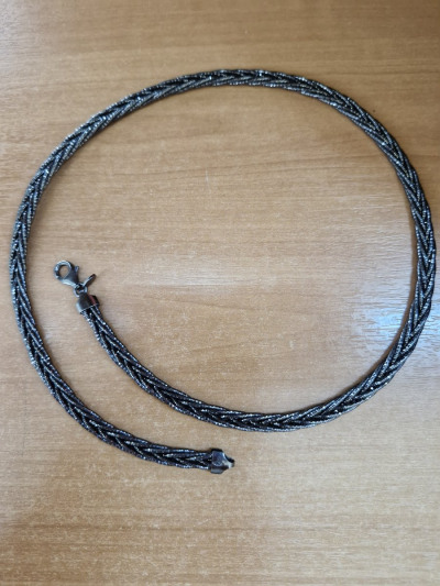 Цепь прочная, плетение косичкой. Достаточно жесткая, не провисает. Цвет черный, но блестит серебристым цветом. Длина 50 см, толщина 5 мм. В комплект есть браслет
