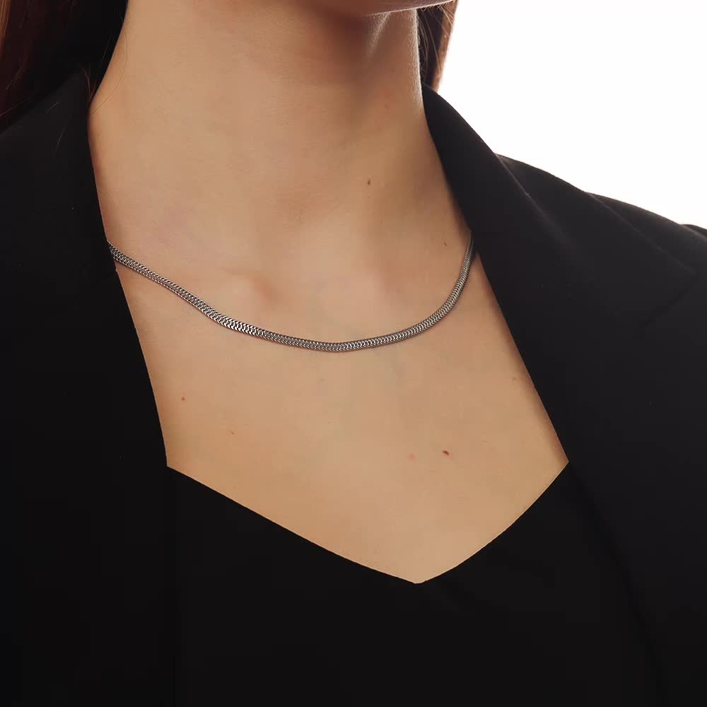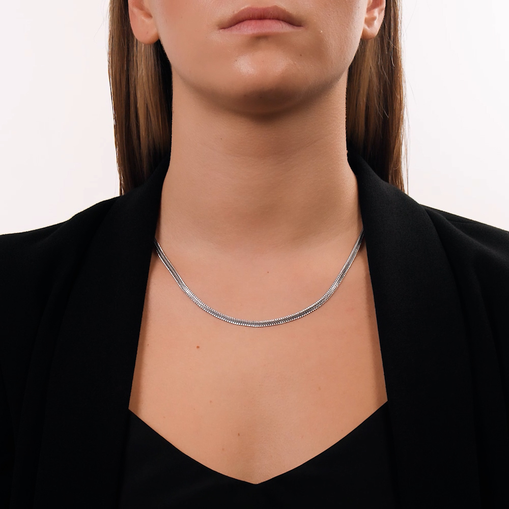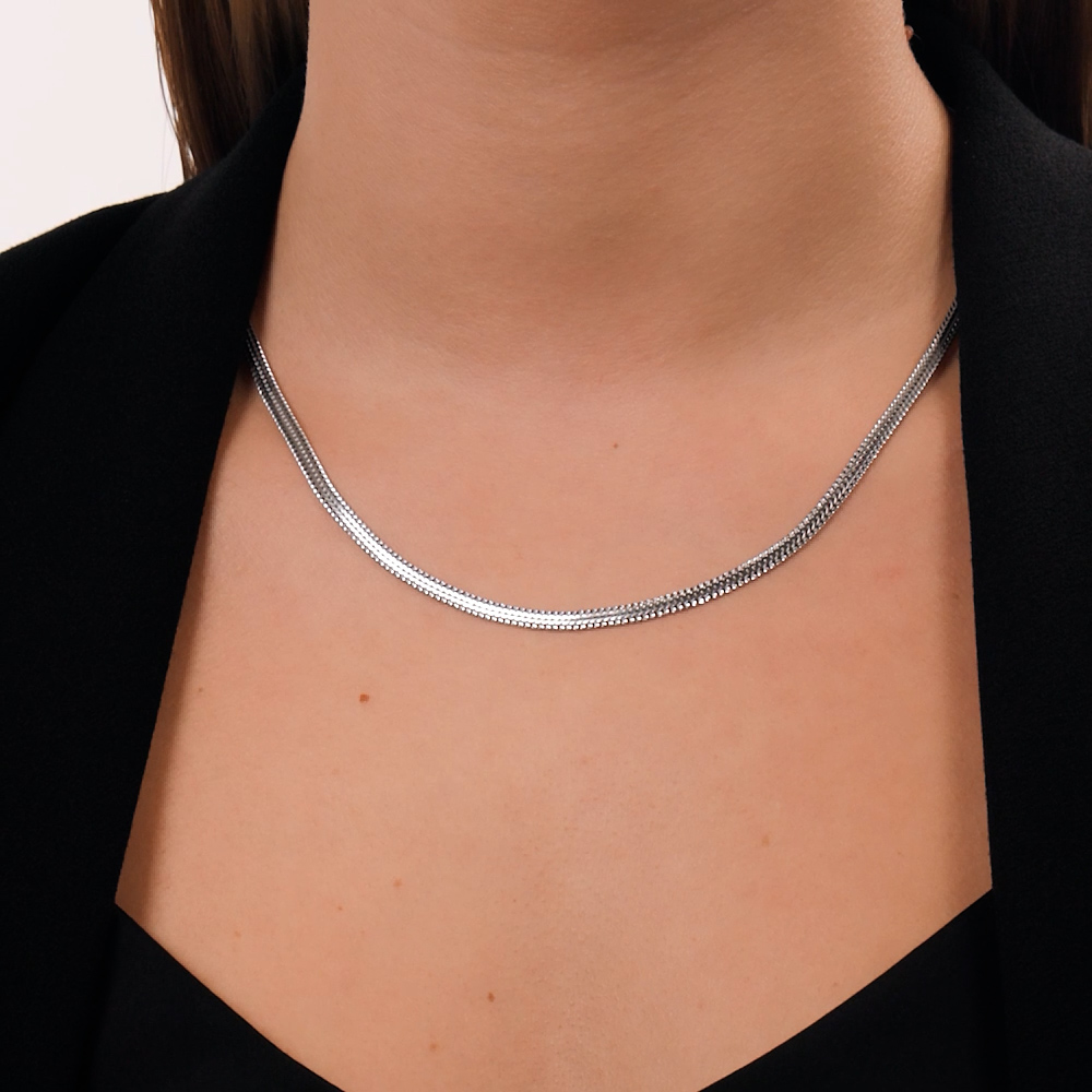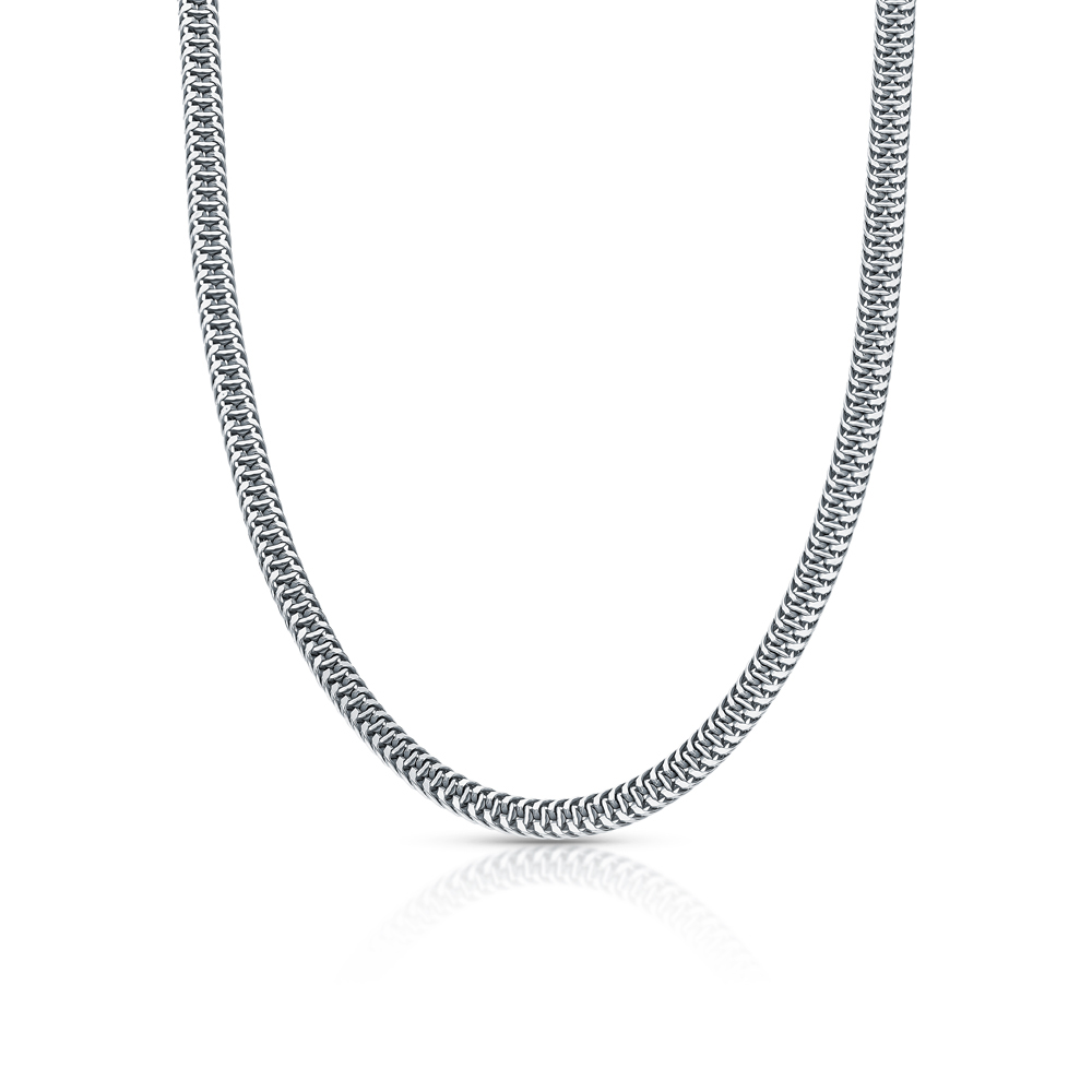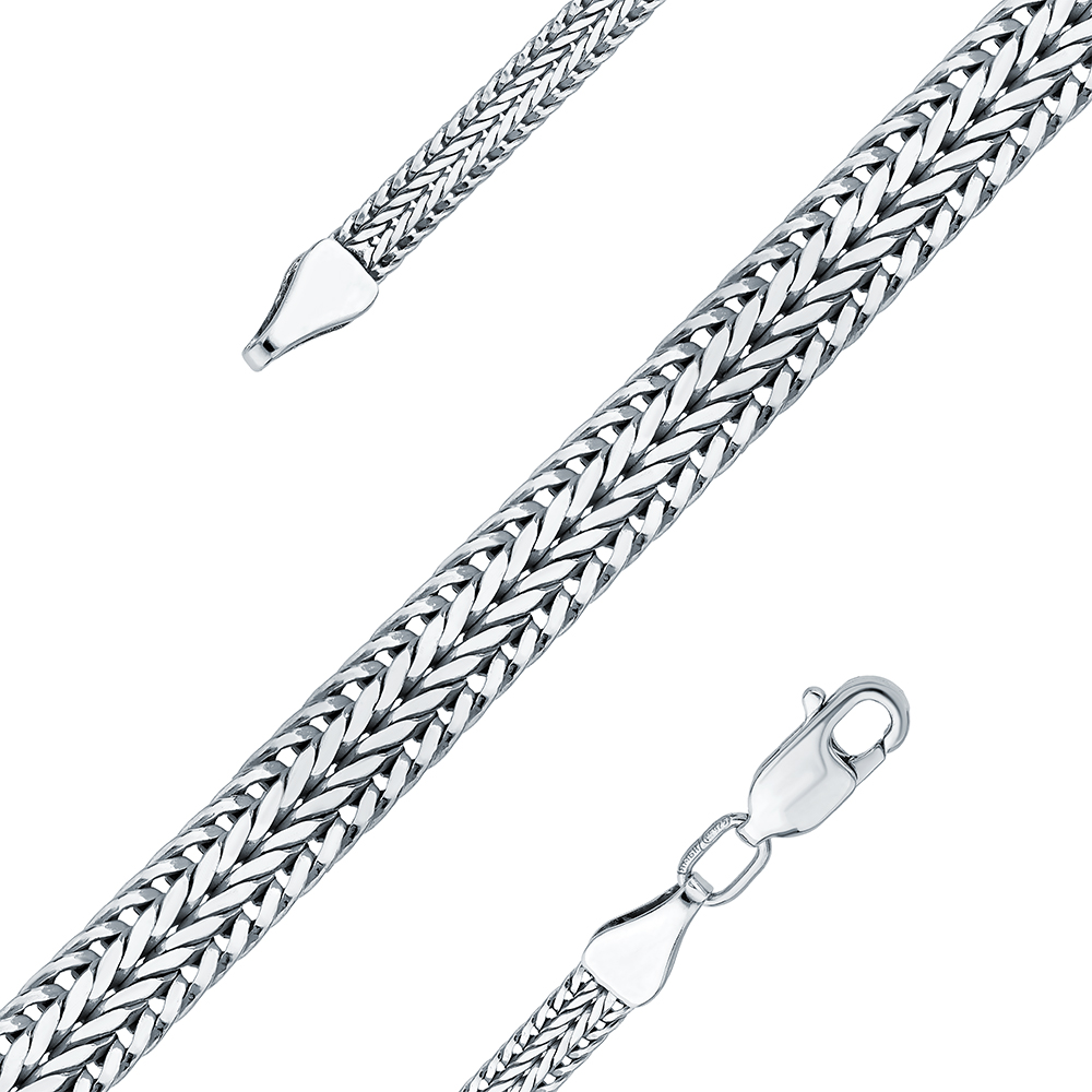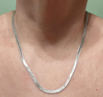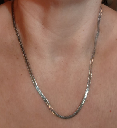 Прочная, красивая. Плоское, якорное плетение создаëт яркий блеск серебра. С изнаночной стороны чешуйки похожи на змейка и тоже очень блестят. Редкое плетение в Ялте я заказала первое и единственное в наличии.