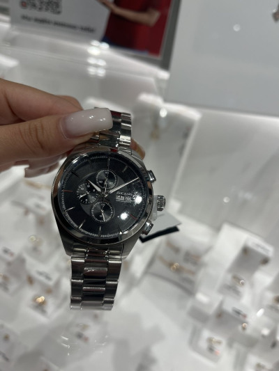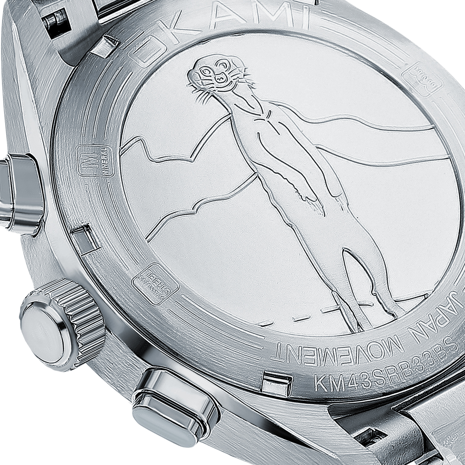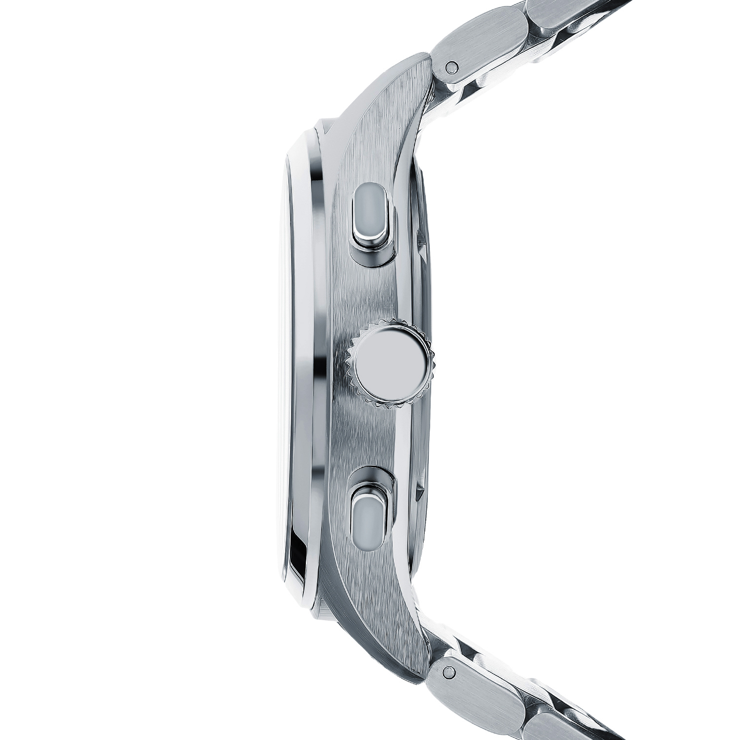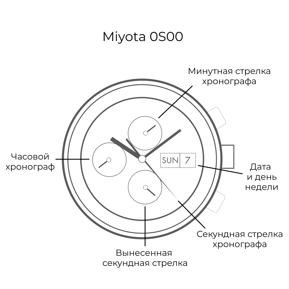 Корпус выполнен из стали, минеральное стекло с антибликом защищает циферблат от внешнего воздействия. Японский кварцевый механизм Miyota 0S00 обеспечивает точный ход и оснащен функциями времени в 12 часовом формате, секундной стрелки, даты, дня недели и хронографа. Водозащита 10 bar (100 m/330 ft)* позволяет плавать в часах.