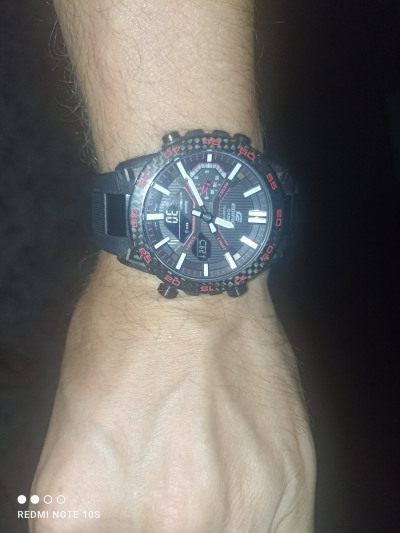 Супер стильный релиз в коллекции Edifice 2022 года из топовой аналого-цифровой серии ECB-2000 в усиленном карбоном корпусе с черным циферблатом и яркими бирюзовыми деталями, покрытым минеральным стеклом и стальным безелем с ионным напылением графитового цвета. Модель получила динамичный и стильный циферблат, который сочетает в себе стрелочную индикацию, два цифровых дисплея и стрелочный ретроградный указатель у отметки девяти часов. Особенностью модели является ее карбоновый корпус — это первые часы в семействе Edifice в корпусе из карбона, до этого все модели линейки Эдифис имели только стальные корпуса. Необычная харизматичная конструкция корпуса выполнена в стилистике подвесок в формульных гонках, где колеса болида крепятся к шасси на карбоновых лучах. В начинке модели используется новый мощный модуль, оснащенный Bluetooth, благодаря чему, часы могут автоматически подключаться к вашему смартфону для синхронизации точного времени, удобной настройки или для быстрого поиска телефона, если он как обычно куда-то пропал (смартфон начнет издавать звуковые сигналы, при нажатии на специальную кнопку на часах). Стоит отдельно отметить наличие в модели солнечной батареи, водозащиты в 10 бар, функции мирового времени, секундомера и таймера обратного отсчета, пяти ежедневных будильников и ежечасного сигнала, возможность отображения текущего дня недели на русском языке. Все это японские инженеры сумели уместить в корпусе толщиной в 10.8 миллиметров.
