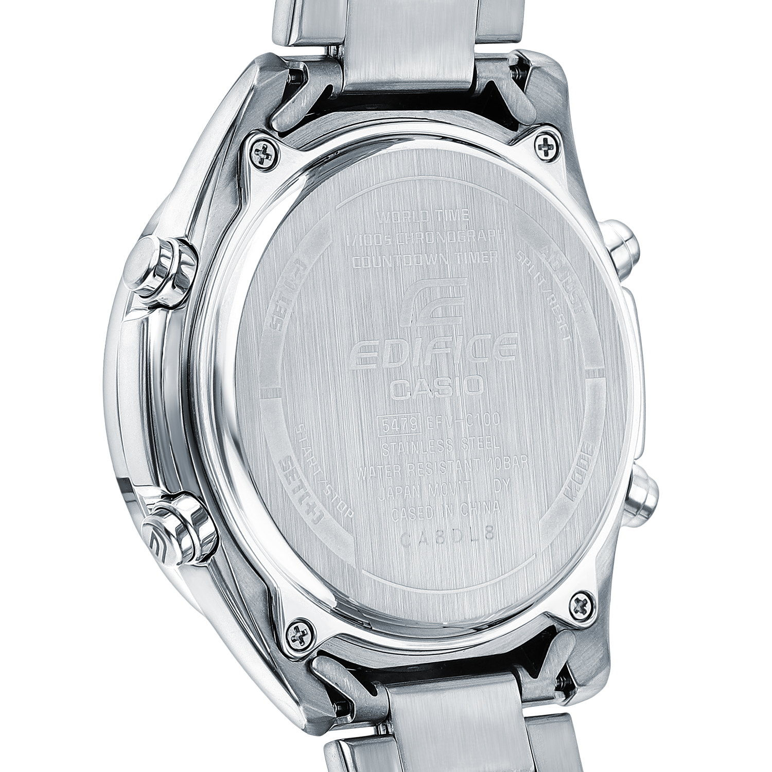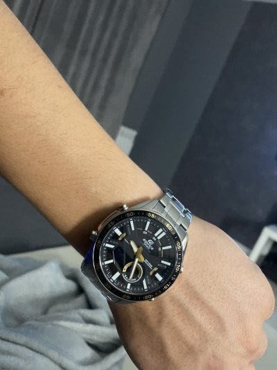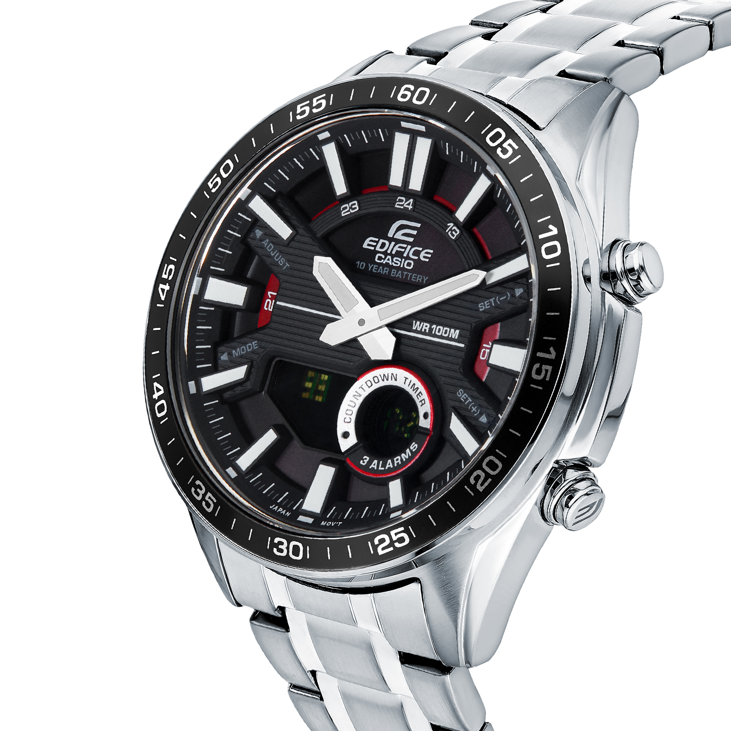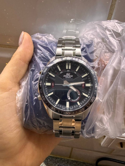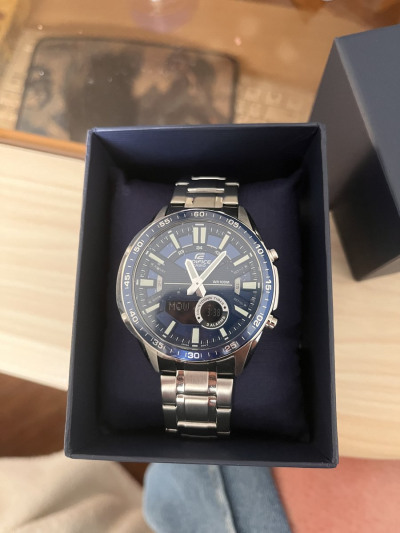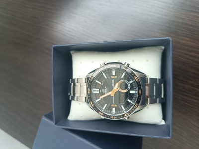 Аналого-цифровой хронограф из серии Edifice в стальном корпусе на браслете. Закаленное минеральное стекло защищает циферблат от механических повреждений, на дисплеях часов отображается текущая дата и день недели, а также показатели таймера и секундомера или содержимое записной книжки (вы можете добавить в часы до 30 контактов). Помимо отличного дизайна со спортивным уклоном, модель обладает водозащитой до 100 метров, а срок работы от одной батареи составит до 10 лет!
