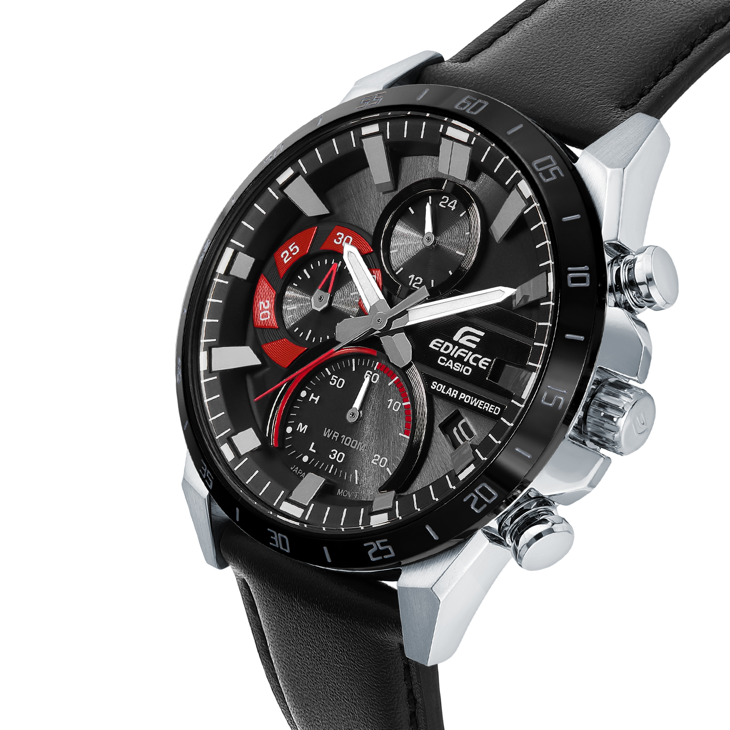 Перед вами стильная модель Edifice SOLAR POWERED в корпусе толщиной всего 12,5 мм. Модель обладает новым динамичным дизайном с явными визуальными отсылками к автомобильному спорту: стальной корпус и безель защищает модуль от внешних повреждений, черный циферблат покрыт прочным минеральным стеклом. Помимо основных показателей времени, данная модель обладает 24-х часовым форматом часовой стрелки и секундомером. Элемент питания заряжается от солнечного света и полного заряда достаточно на 180 дней нахождения в полной темноте. Как и все модели Edifice, часы обладают водозащитой в 10 Бар.