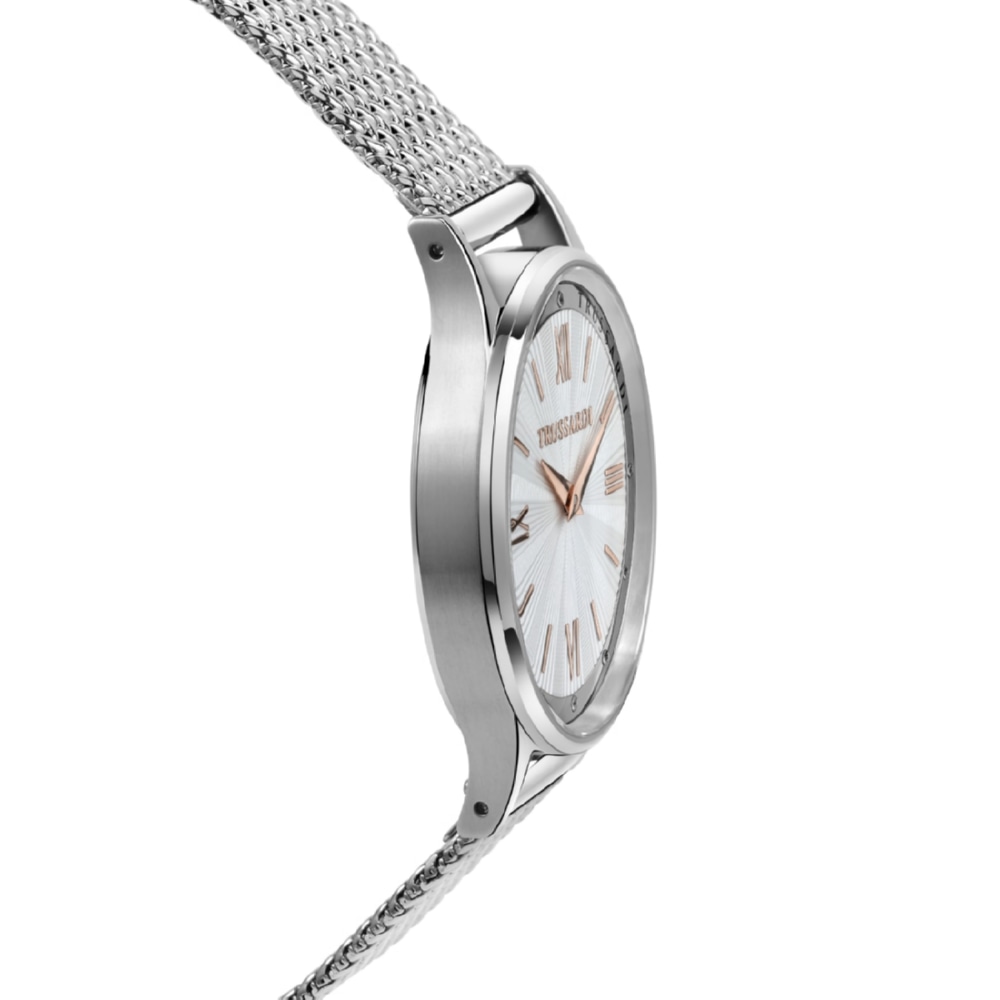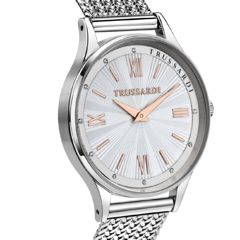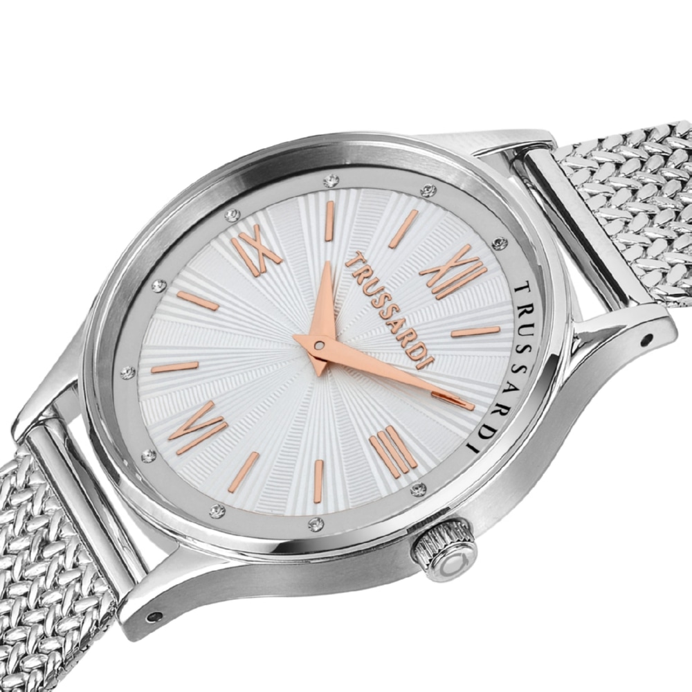 В элегантных и изысканных часы Trussardi R2453152503 из коллекции T-STAR все внимание к деталям. В модели установлен циферблат с узором «солнечные лучи», который украшают сияющие кристаллы. В часах установлен японский кварцевый механизм MIYOTA GL26. Прочное минеральное стекло. Диаметр корпуса – 34 мм. Водостойкость 5 АТМ (мытье рук, дождь). Рифленая заводная головка. Часы выполнены из нержавеющей стали 316L с частичным PVD-покрытием. Браслет миланского плетения с настраиваемой застежкой. Гарантия 2 года. Страна производства - Италия. В комплекте с часами: индивидуальная упаковка, паспорт, инструкция, гарантийный талон. Итальянский модный бренд с вековой историей и традициями. Компания была основана Данте Труссарди в 1911 году в Бергамо как небольшая фабрика по производству дорогих роскошных кожаных перчаток. За несколько лет его высококачественное сырье и постоянное совершенствование методов обработки кожи сделали Trussardi одной из самых известных фирм на международном рынке аксессуаров, а Данте Труссарди стал официальным поставщиком британской королевской семьи.