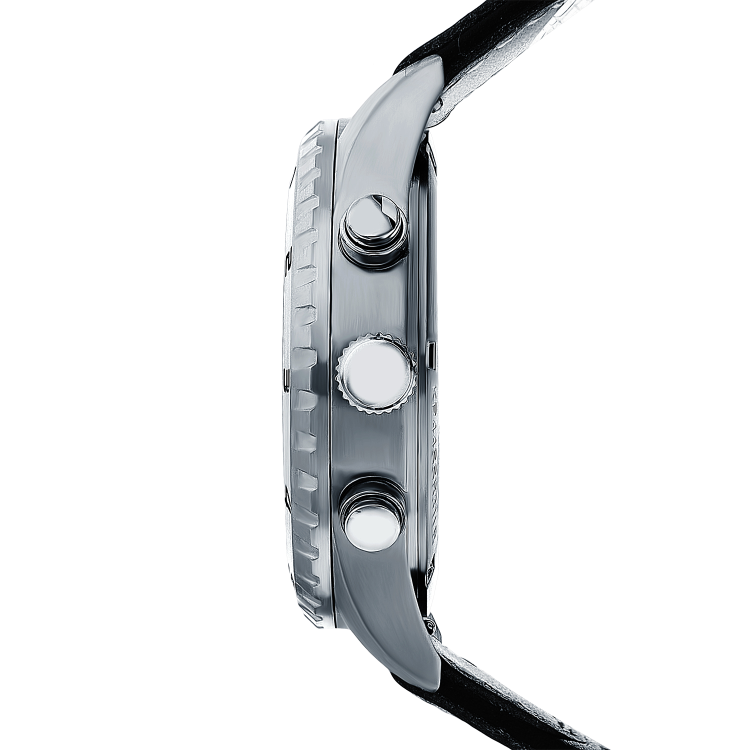 Корпус выполнен из стали, минеральное стекло с антибликом защищает циферблат от внешнего воздействия. Японский кварцевый механизм Seiko VR32 обеспечивает точный ход и оснащен функциями времени в 12/24 часовом формате, секундной стрелки, даты и хронографа. Водозащита 10 bar (100 m/330 ft)* позволяет плавать в часах.