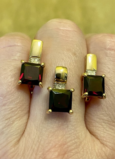 Серьги не мелкие, заметные. Гранаты прекрасны, хотя хотелось бы посветлее. В подвеске камень темнее, заказывайте несколько и выбирайте. Модель смотрится дорого, солидно. Осталось купить кольцо. В наборе выглядит особенно интересно.