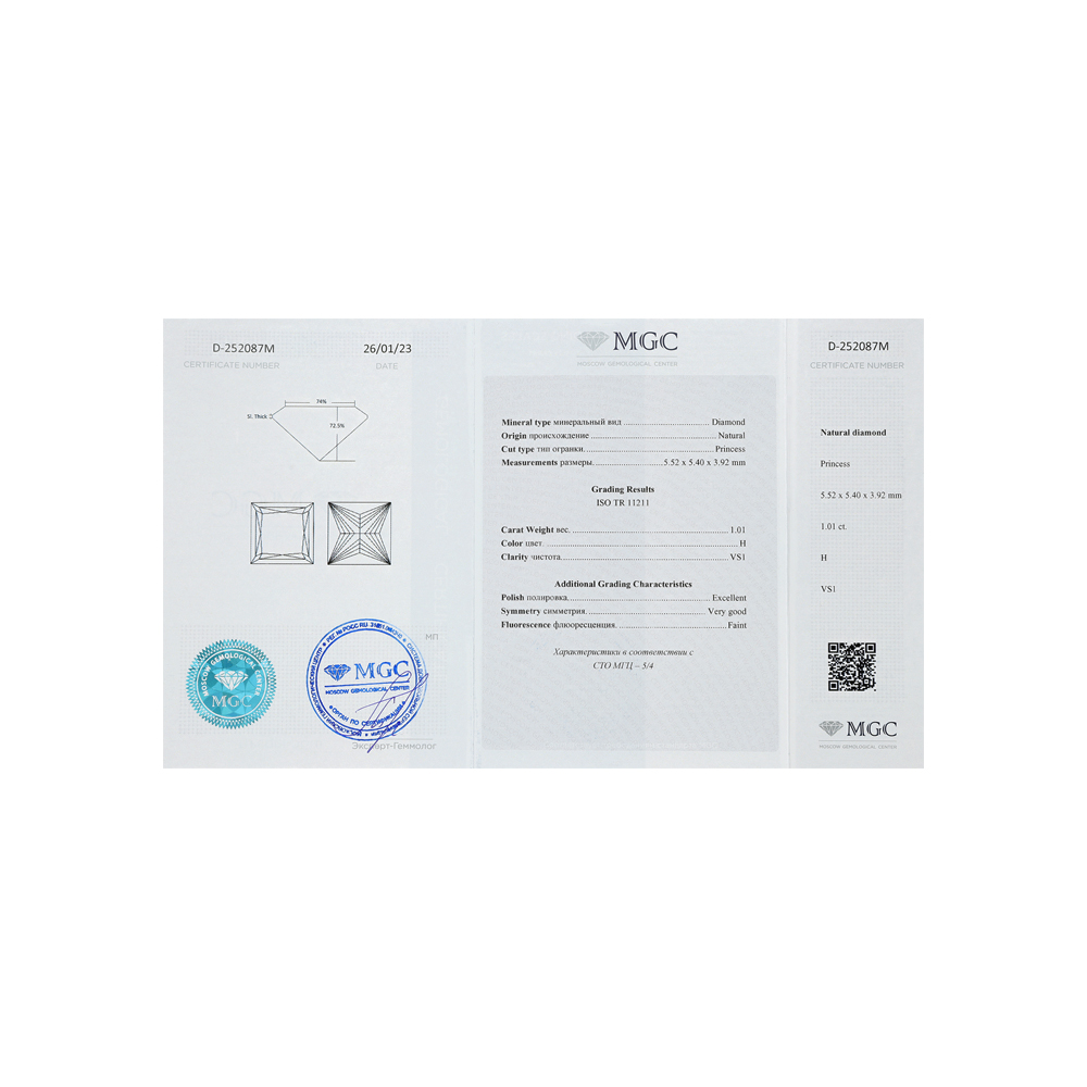 1 бриллиантом природным, 1.01 карат, огранка принцесса 65 граней, цвет 5, чистота 4, тип огранки А;