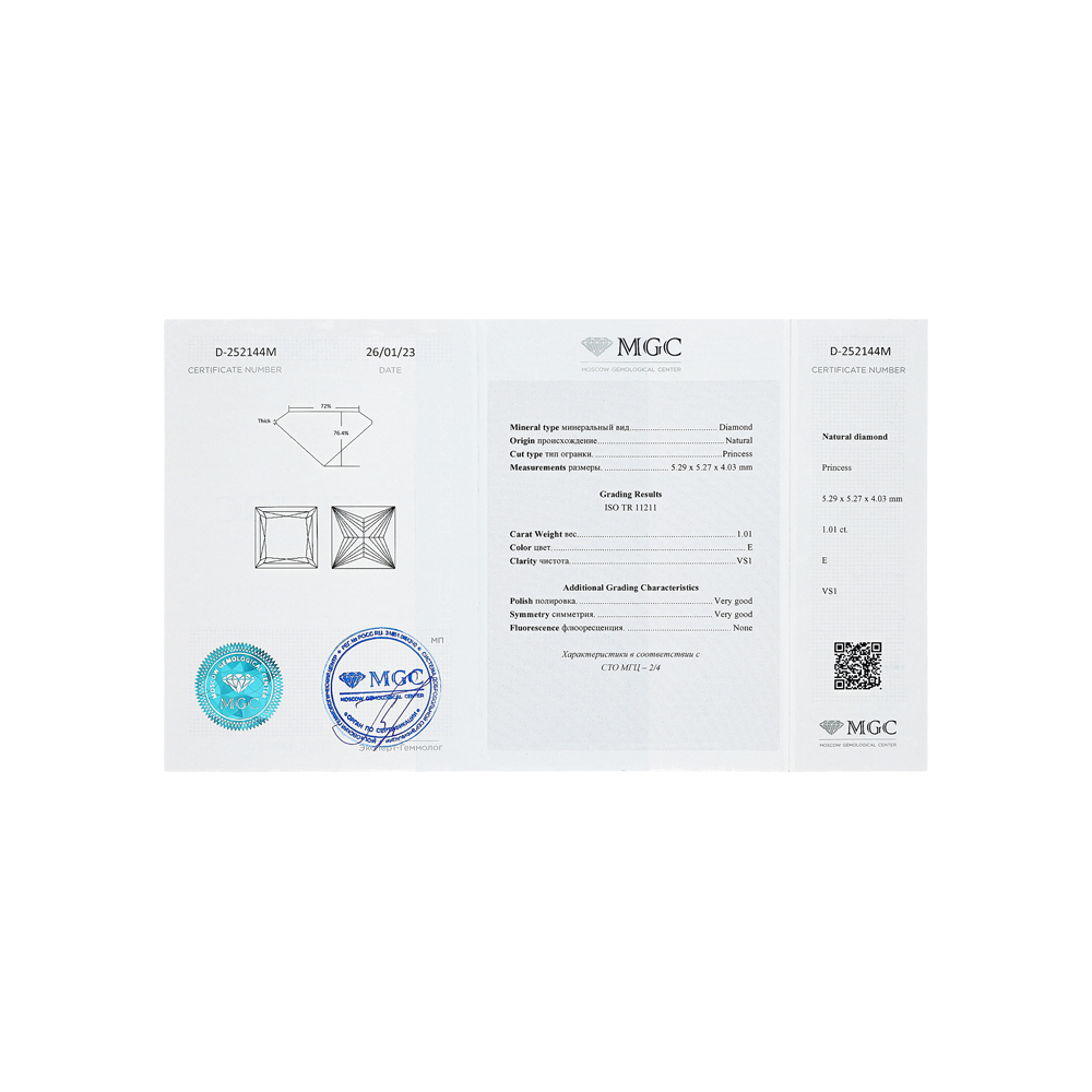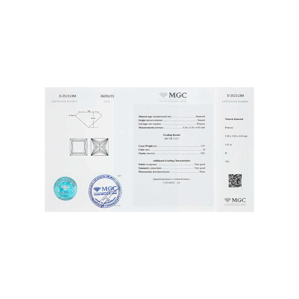 1 бриллиантом природным, 1.01 карат, огранка принцесса 65 граней, цвет 1, чистота 4, тип огранки А;
