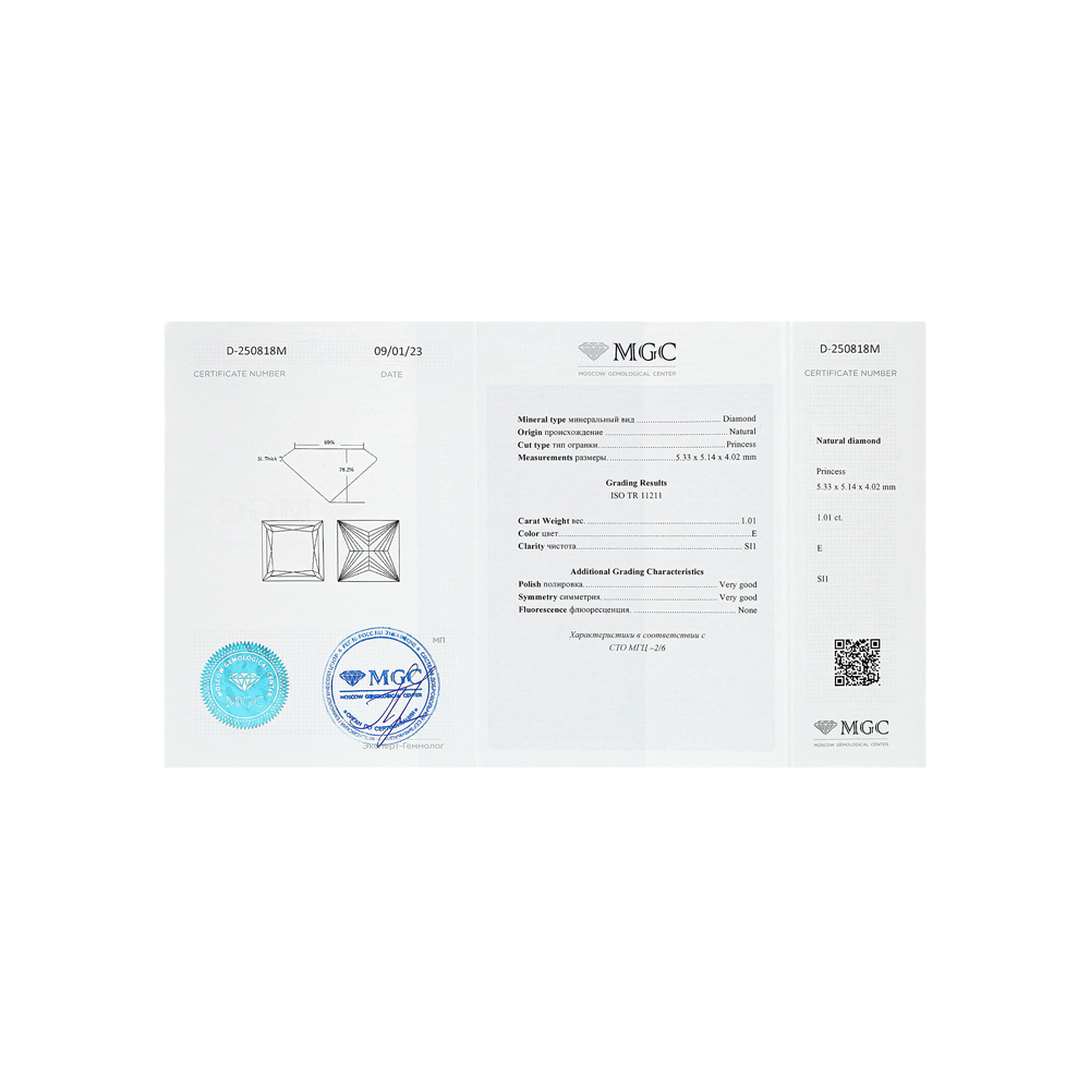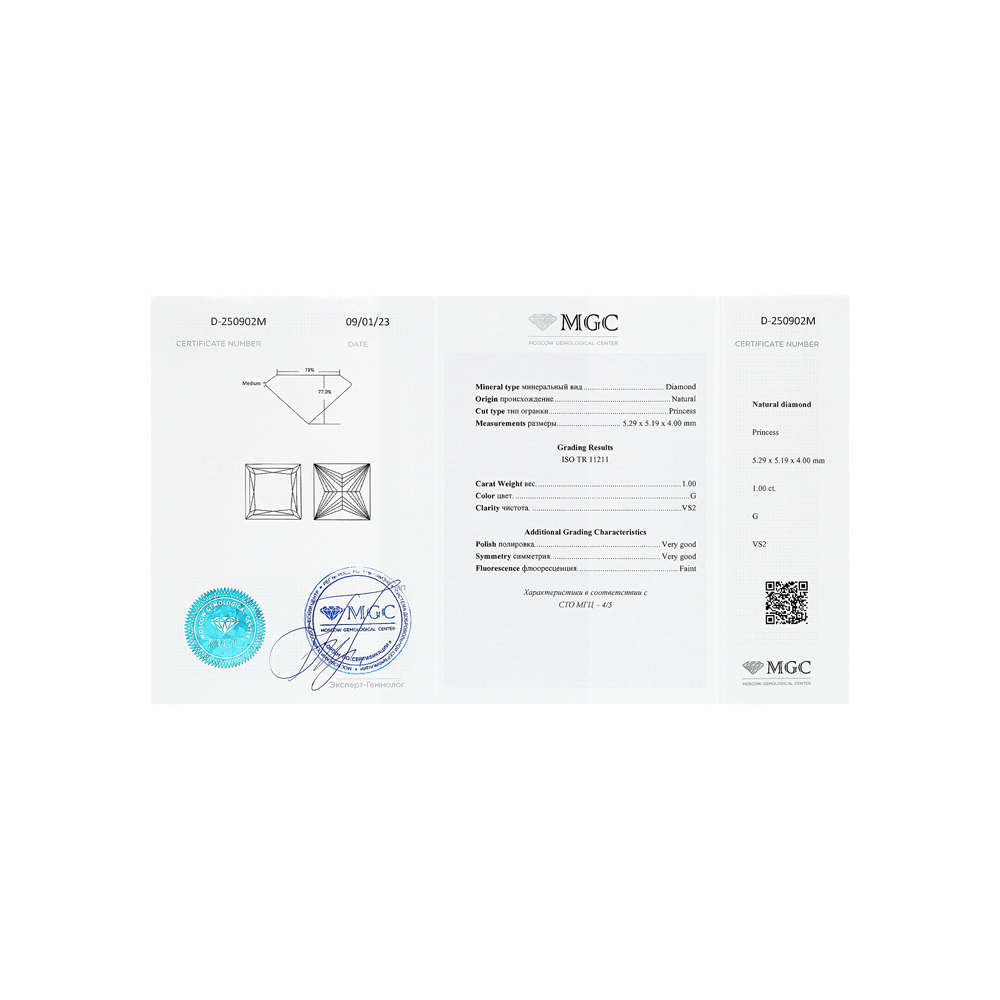 1 бриллиантом природным, 1 карат, огранка принцесса 65 граней, цвет 4, чистота 5, тип огранки А;