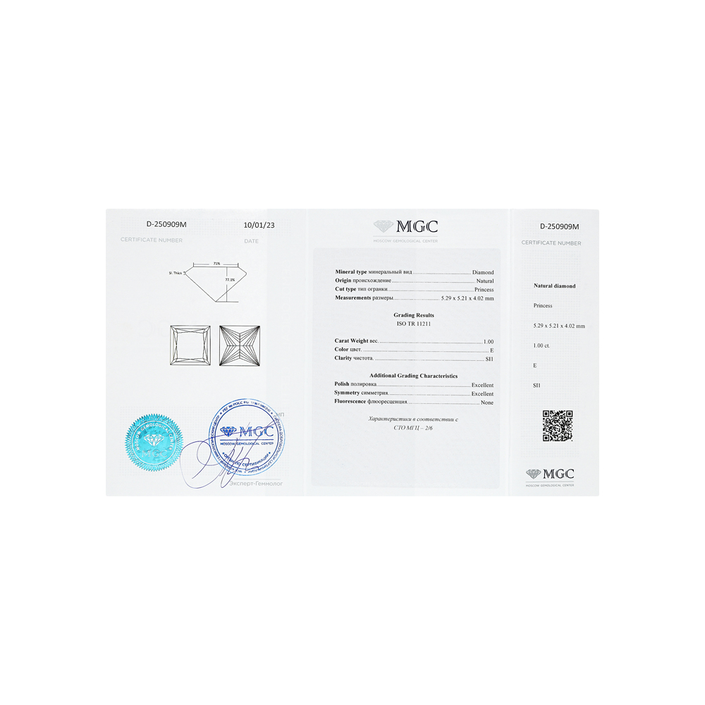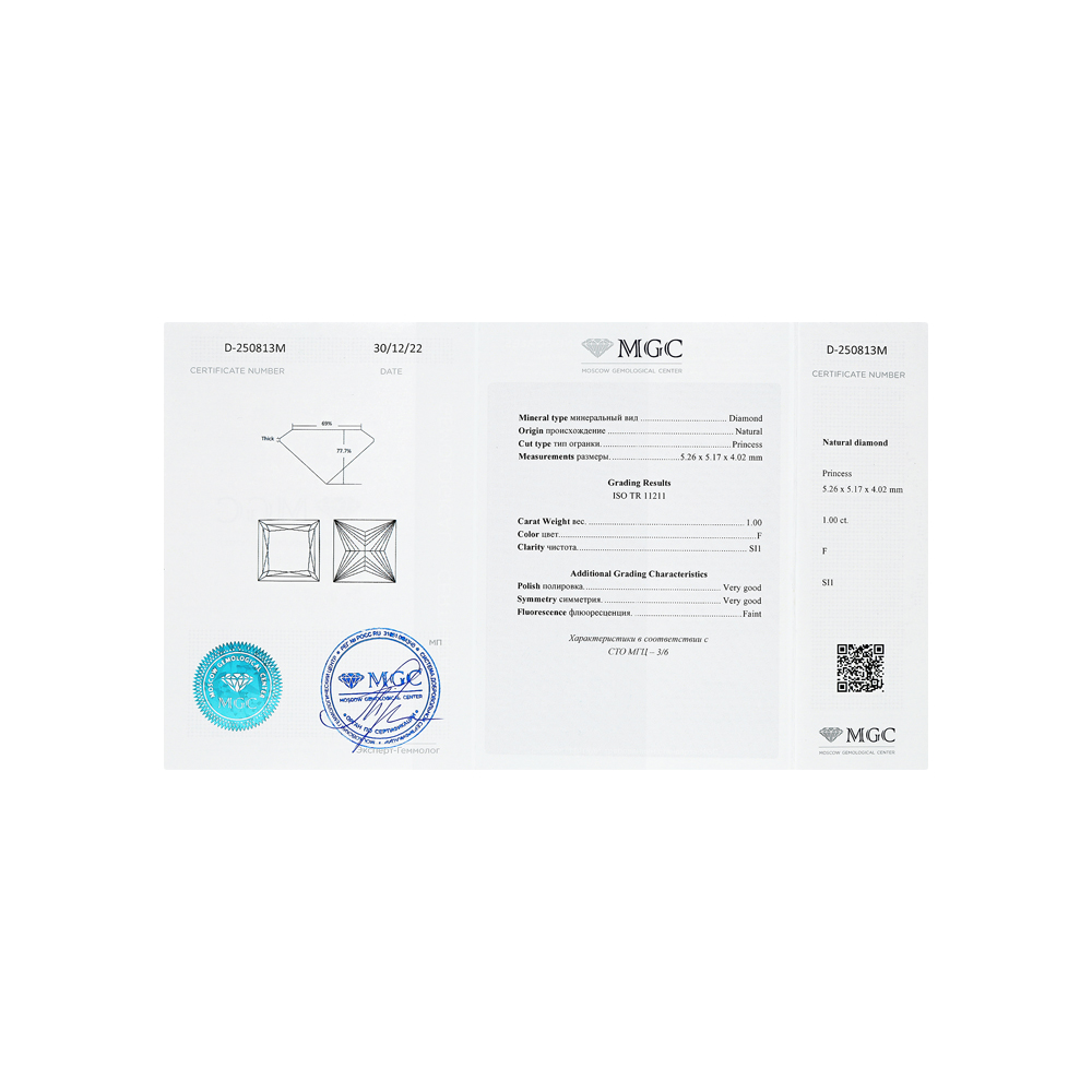 1 бриллиантом природным, 1 карат, огранка принцесса 65 граней, цвет 3, чистота 6, тип огранки А;