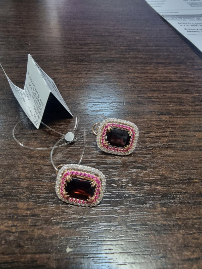 Золотые серьги с бриллиантами природными, гранатами природными и рубинами выращенными