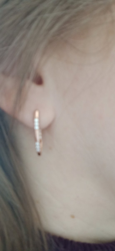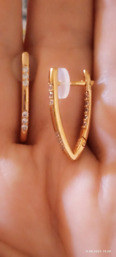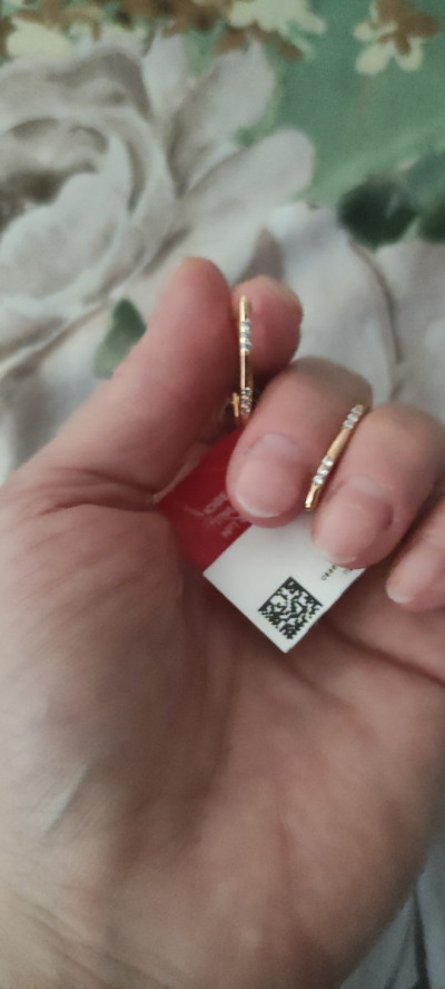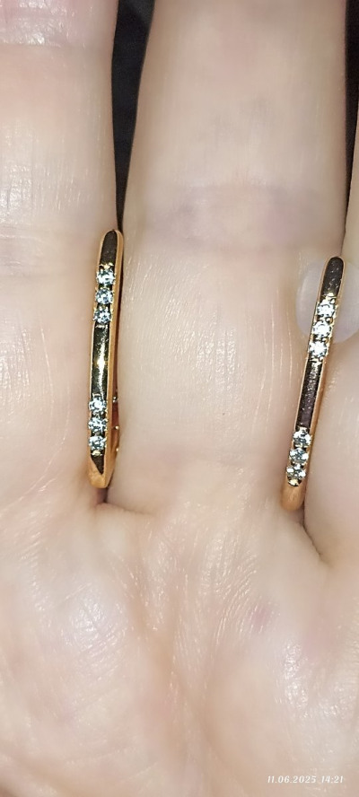 Очень красивые серёжки необычной формы. Давняя хотелка. Покупкой довольна! Камушки сверкают, от золотых не отличить. По весу чуть легки для меня).