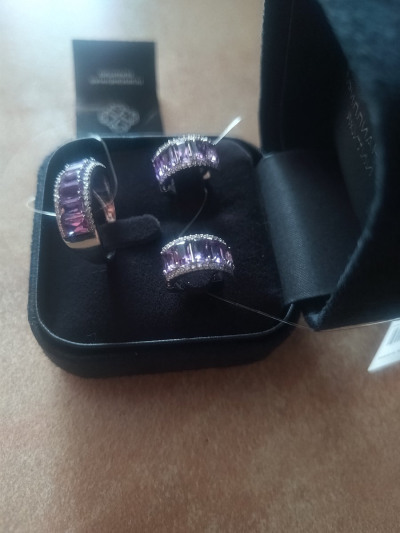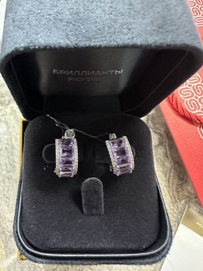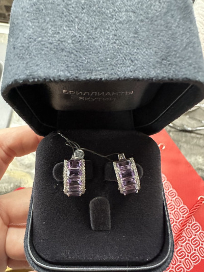 Любимый комплект.Долго к нему присматривалась и купила. Очень красивые аметисты в обрамлении бриллиантов,ярко переливаются на свету.Оригинальное решение расположения камней в украшениях,размеров серёжек и их застежки говорят о высоком уровне профессионализма дизайнеров и исполнителей этого комплекта украшений.