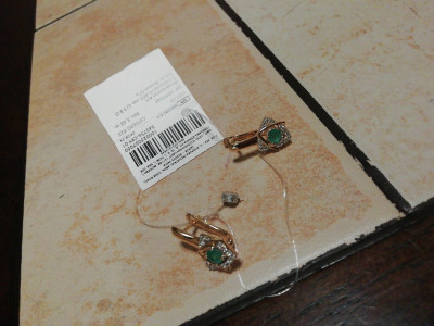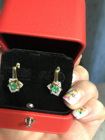 Красивые,хорошая посадка,не мелкие,произведено в Индии.Изумрудик хорош.Смутил цвет позолоты,слишком яркий,особенно задняя часть ,будто набрызгано толстым слоем краски.,мне не очень этот факт понравился.Но смотрятся хорошо.В золото такую модель,лимонное или белое,будет самое то.Носить все равно будем,модель интересная.