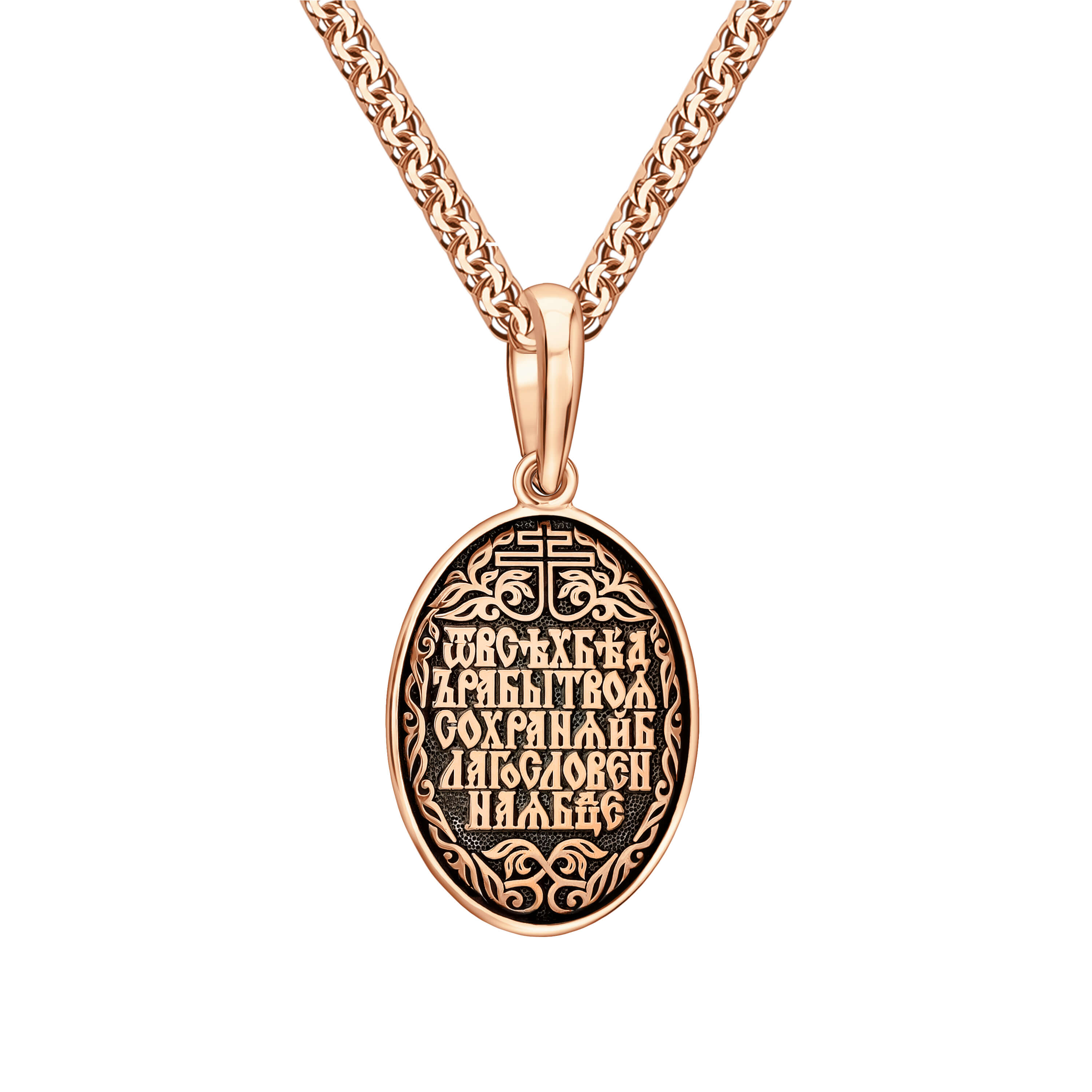 Золотая подвеска с изображением Казанской иконы Пресвятой Богородицы. Молитвы перед образом Казанской иконы Божией Матери могут помочь Вам во многих жизненных делах, а кроме того Ей молятся при унынии, печали и бедствиях, когда с напастями уже не хватает сил бороться. «От всех бед рабы твоя сохраняй, благословенная Богородица!», — написано на обороте образка. Над молитвой изображен процветший Крест — символ новой, райской жизни, которую Господь даровал своим воскресением.