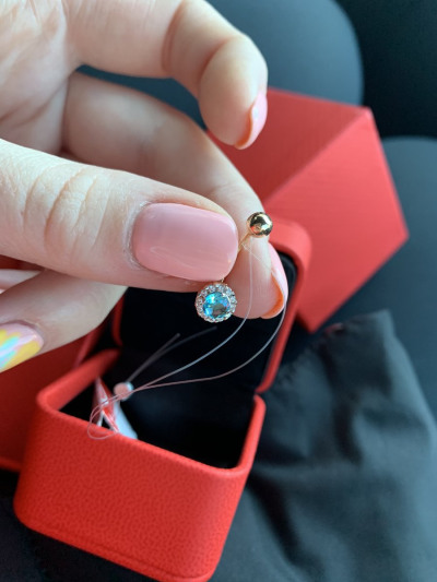 Красивый , золотой , блестит , как уже писала из минусов - фианит голубой - смотрится дёшево ! Не похож на камень - больше на пластиковый страз!