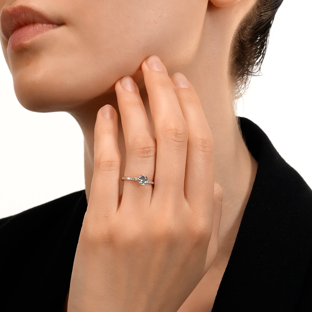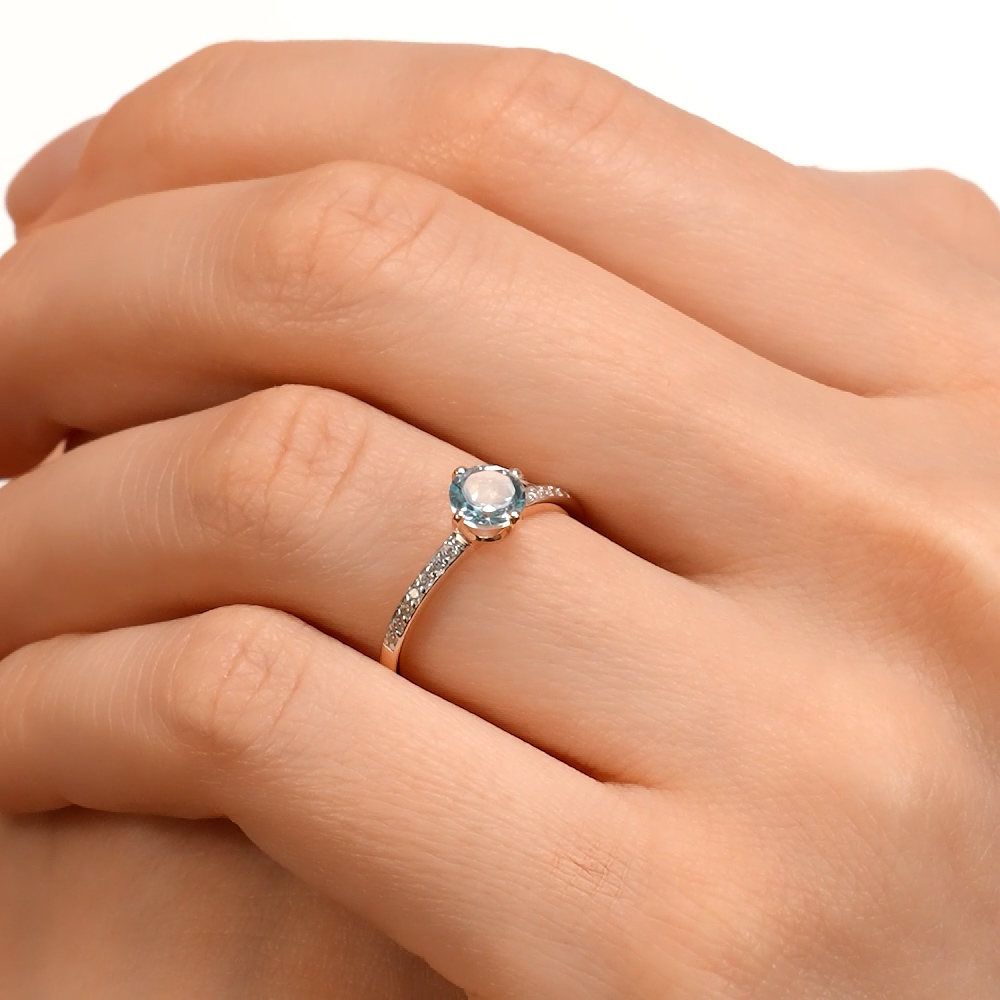 В редких случаях характеристики украшения или упаковка могут иметь отличия от представленных на фото или в описании.Кольцо с 1 топазом скай природным, 0.55 карат;