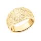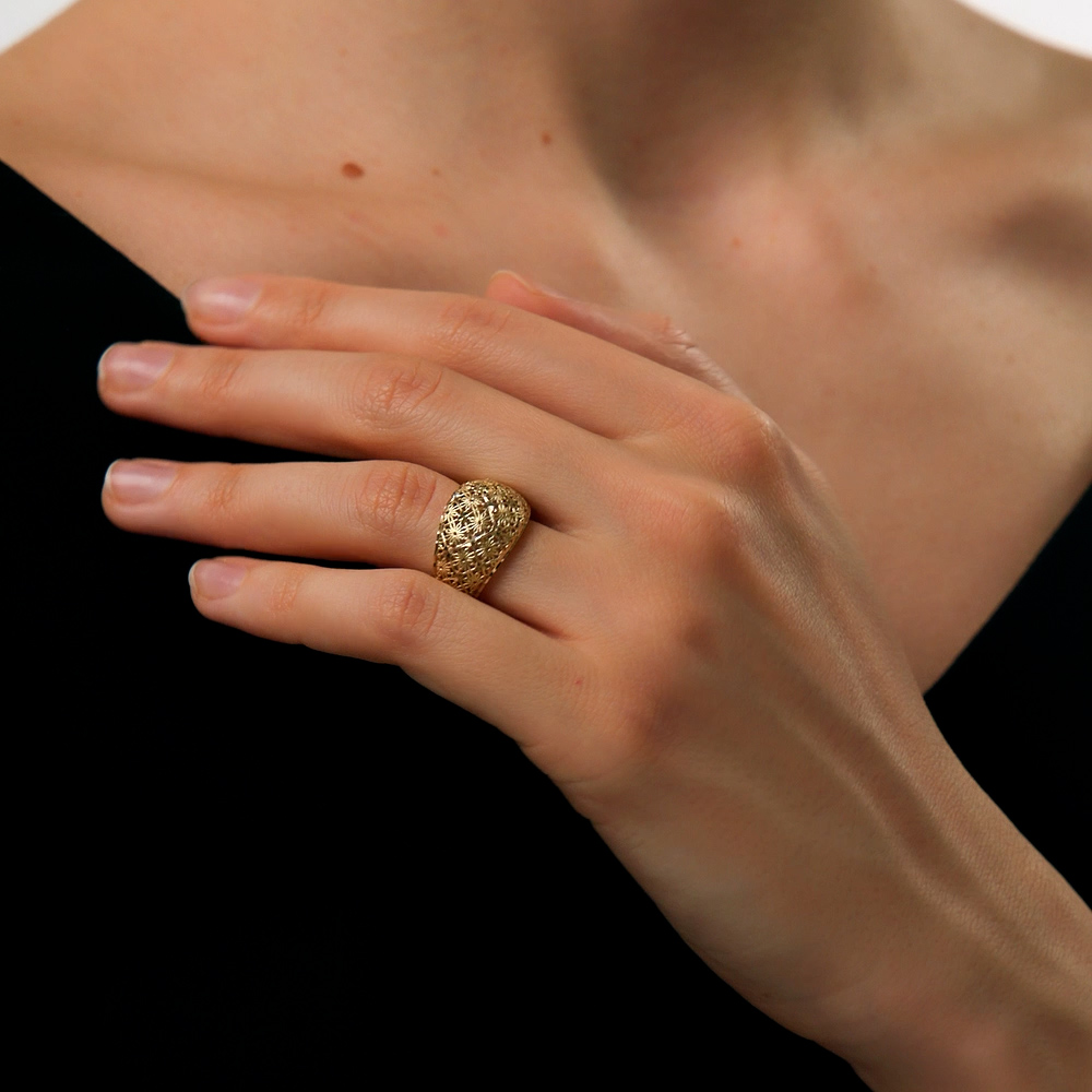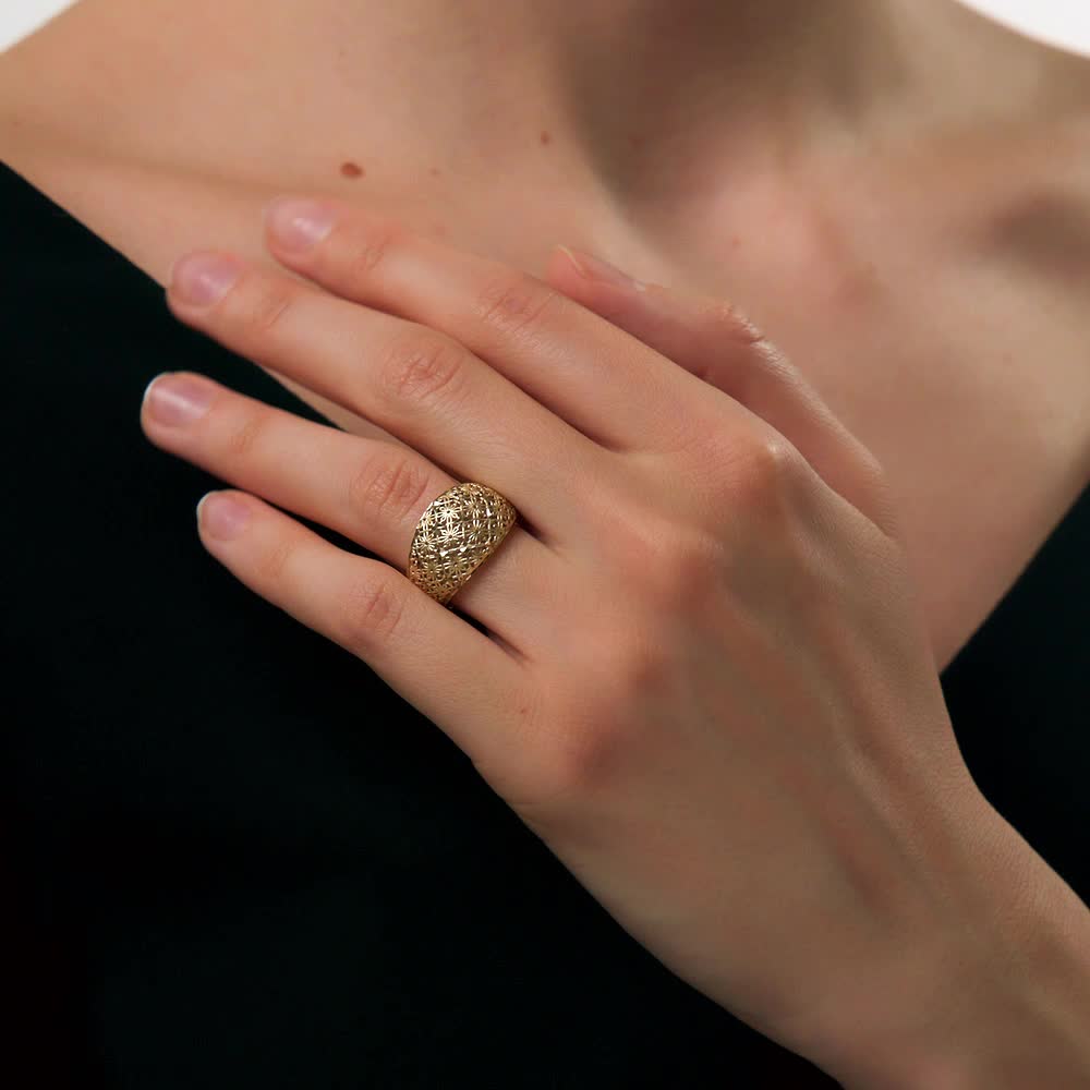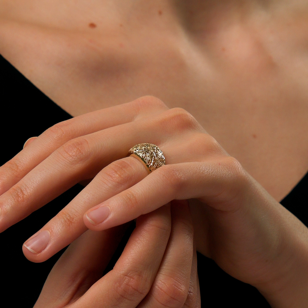 Кольцо из жёлтого золота,очень красивое, идёт размер в размер, смотрится объемным,но есть не большая неприятность, снаружи у кольца широховатая поверхность будет цепляться,снизу такого не ощущается.