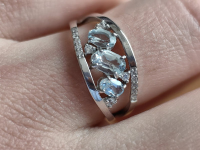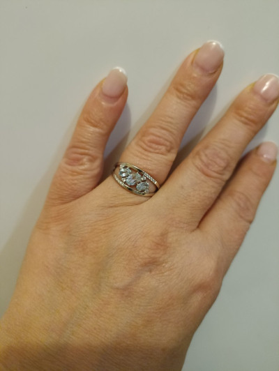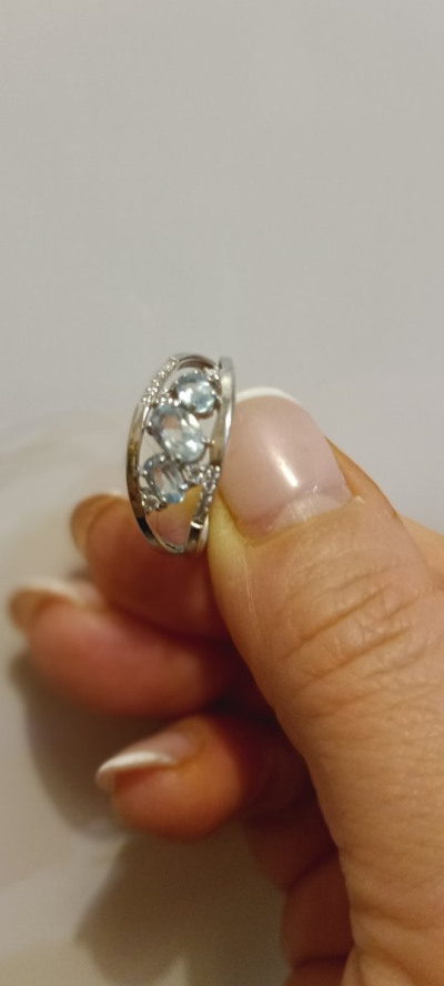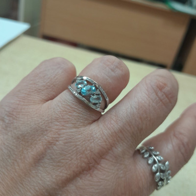 Красивое, нежное колечко. Камни по факту скорее прозрачные, чем голубые. Очень цепляется. Надо носить аккуратно