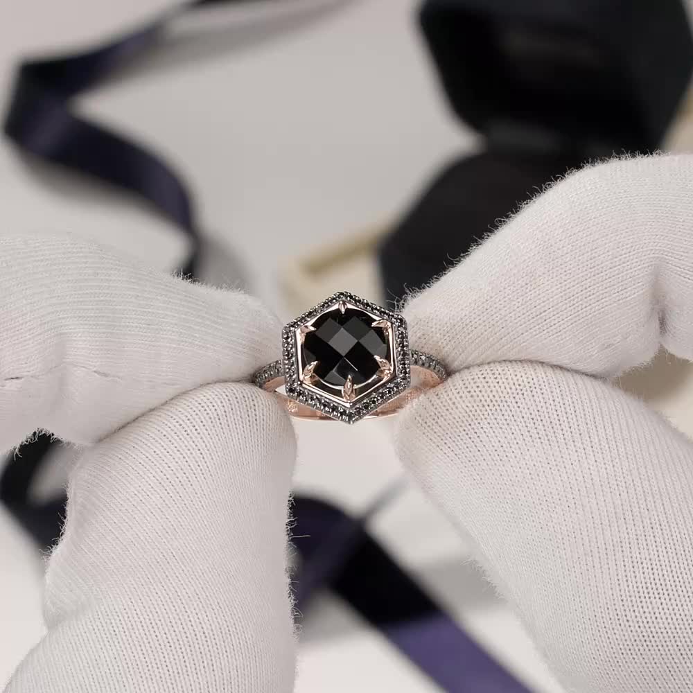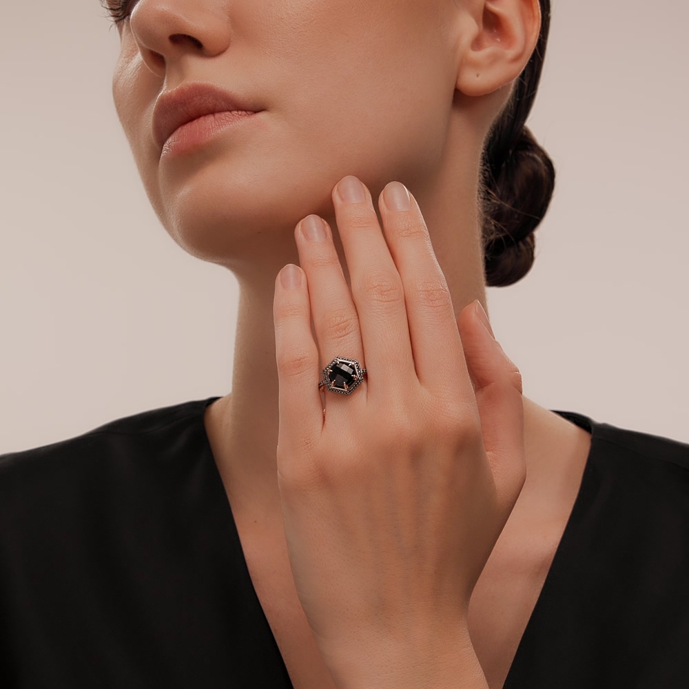Золотое кольцо с бриллиантами чёрными природными и агатами природными