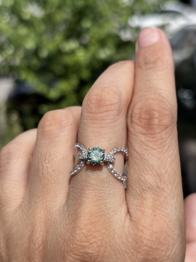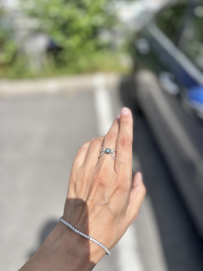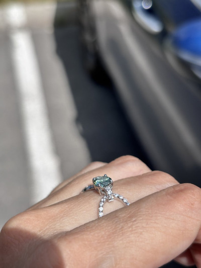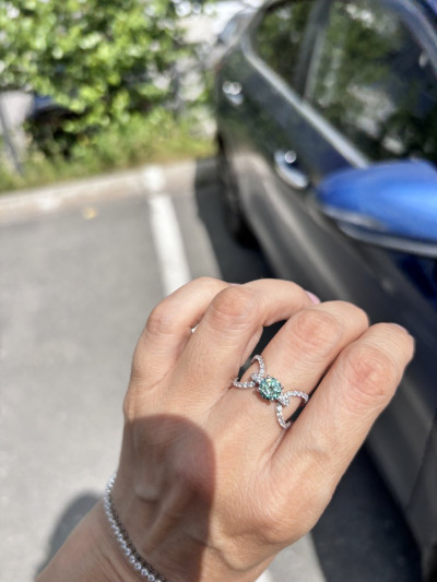 Муассанит 0,8 карата, очень красивый, очень сияющий. К украшению выдают сертификат GRA, который прилагается ко всем муассанитам на рынке. Форма кольца очень интересная. Единственное - лучше брать на полразмера больше