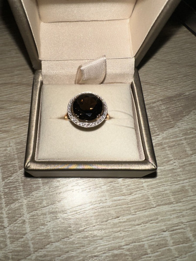 Золотое кольцо с фианитами и кварцами дымчатыми синтетическими