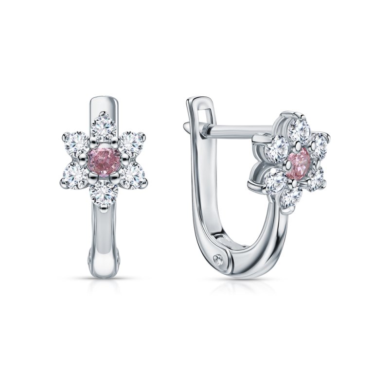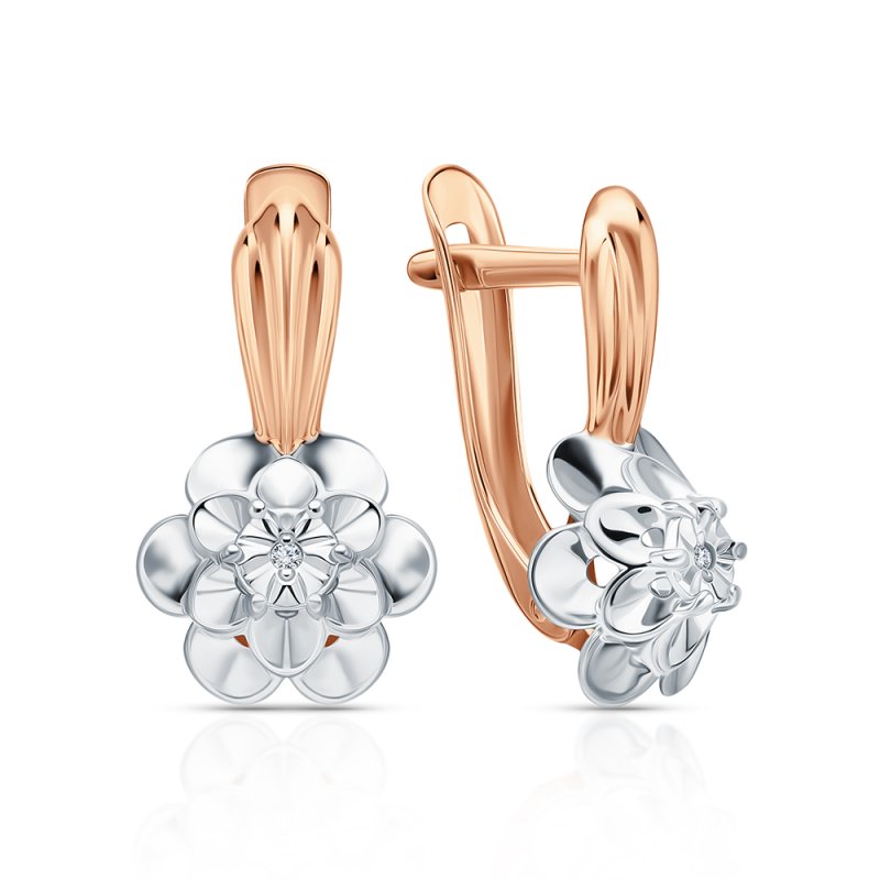 Серьги с 2 бриллиантами природными, 0.02 карат, огранка круг 57 граней, цвет 4, чистота 7, тип огранки А; 16 бриллиантами природными, 0.06 карат, огранка круг 17 граней, цвет 2, чистота 2, тип огранки А; 16 бриллиантами природными, 0.02 карат, огранка круг 17 граней, цвет 2, чистота 2, тип огранки А; Розовое и белое золото 585 пробы.