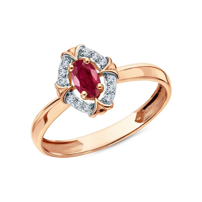 Кольцо с 20 бриллиантами природными, 0.11 карат, огранка круг 17 граней, цвет 2, чистота 3; 1 рубином природным, 0.21 карат, цвет 3, чистота 4; 1 рубином природным, 0.2 карат, цвет 3, чистота 4; Розовое золото 585 пробы.
